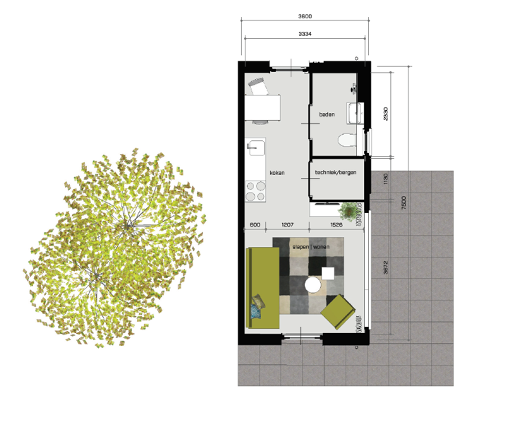 Tiny houses zijn in trek: minimalistisch wonen is het nieuwe wonen. In de tiny houses wordt slim gebruik gemaakt van de ruimte. Er is een woon-, slaap- en kookgedeelte en een aparte badkamer. Een volwaardige woning op 27 m2! Ook aan het milieu is gedacht. De tiny houses zijn circulaire woningen: er is zoveel mogelijk gebruik gemaakt van onderhoudsarme materialen die in de toekomst hergebruikt kunnen worden. Zo komen we samen een stapje dichter bij een duurzamere wereld. Benieuwd hoe zo'n tiny house er van binnen uit ziet? Hieronder zie je een plattegrond: