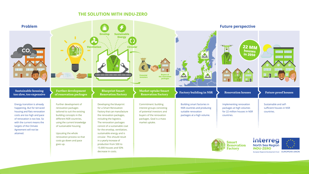 De Provincie Overijssel heeft het project samen met partners uit zes landen uit de North Sea Region opgepakt: Nederland, België, Duitsland, het Verenigd Koninkrijk, Zweden en Noorwegen. Het project, dat drie jaar loopt, moet een ontwerp voor een innovatieve fabriek opleveren. De fabrieken kunnen na afloop van het project, in de zomer van 2021, in de verschillende Europese landen worden gebouwd. De productie van de renovatiepakketten die voor de huizen nodig zijn, krijgt daarmee een enorme impuls en de kosten per huis gaan aanzienlijk naar beneden. Dit project gaat een enorme bijdrage leveren bij het uitvoeren van het Nederlandse klimaatakkoord.
